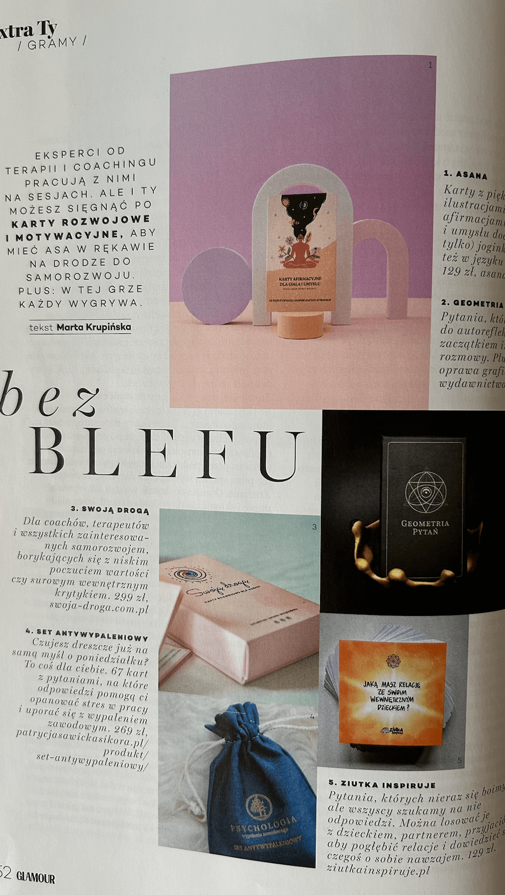Z ogromną radością informujemy, że nasze Karty afirmacyjne dla ciała i umysłu zostały wyróżnione w najnowszym numerze magazynu Glamour Polska. To dla nas ogromny zaszczyt znaleźć się w gronie polecanych produktów, które wspierają uważność, równowagę i troskę o siebie na co dzień.